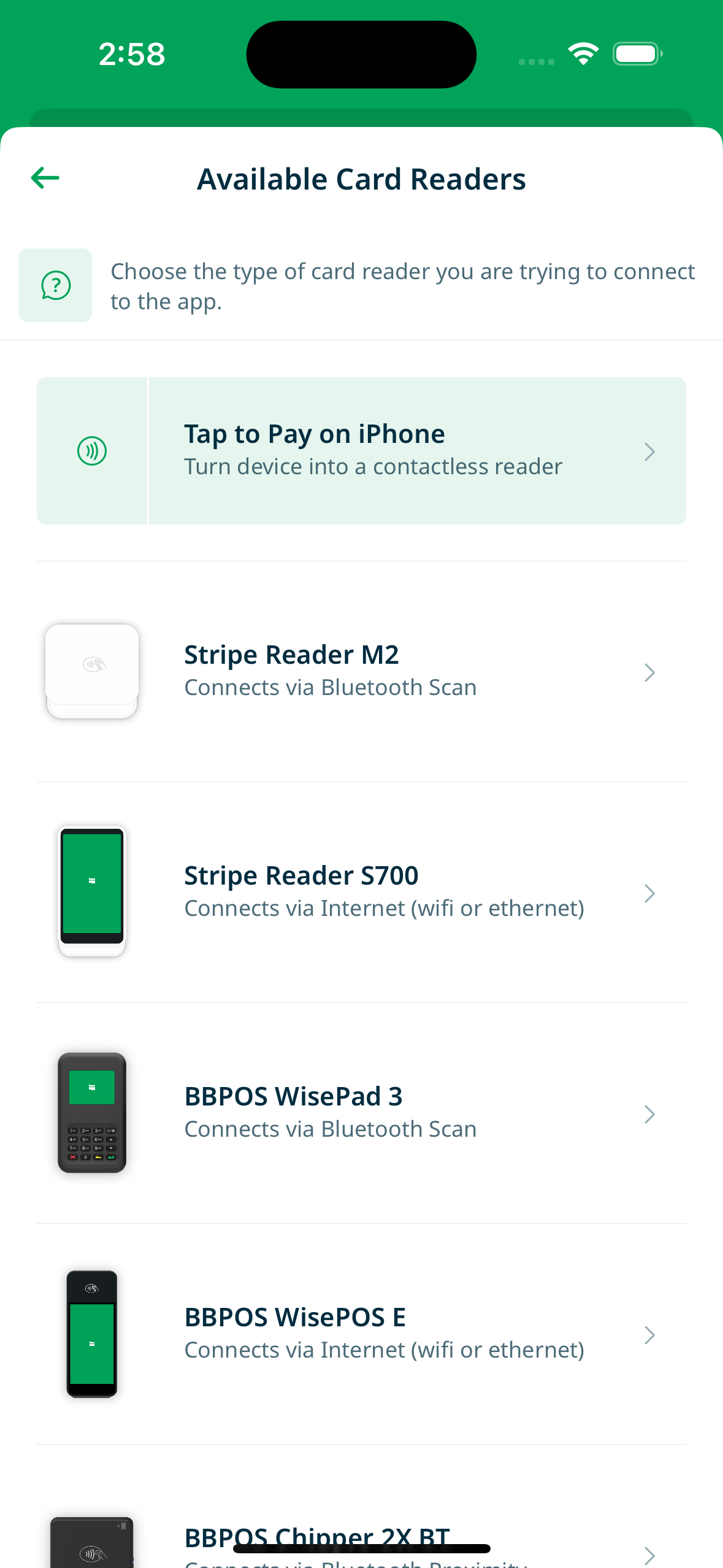 Card readers accept chip cards, swipe, and work offline. If you need to accept non-contactless payments or want lower per-transaction fees, a Bluetooth reader is a great addition.